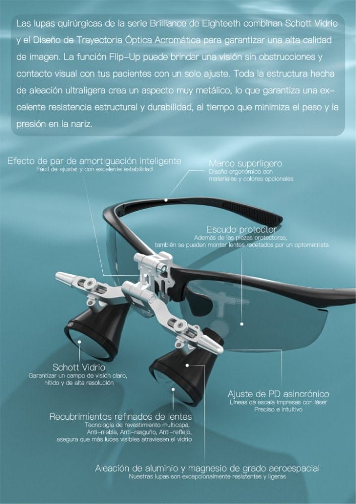 Las lupas quirúrgicas de la serie Eighteeth Brilliance combinan el cristal Schott y el diseño de la trayectoria óptica acromática para garantizar una alta calidad de imagen. La función Flip-Up permite una visión sin obstáculos y el contacto visual con sus pacientes con un solo ajuste. Toda la estructura de aleación ultraligera crea un aspecto metálico fresco, garantizando una excelente resistencia estructural y durabilidad, al tiempo que minimiza el peso y la presión sobre la nariz al llevarla.